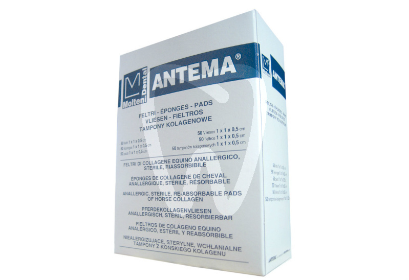 30 days return guaranteeANTEMA COLLAGENE is a hemostatic collagen felt made of purified equine collagen, designed as an adjunct to help control capillary bleeding in dental procedures. The 1 x 1 cm format is intended for placement in small surgical sites, commonly in dentoalveolar surgery and tooth extractions. Sales format: 1 blister containing 50 pieces (1 x 1 cm).