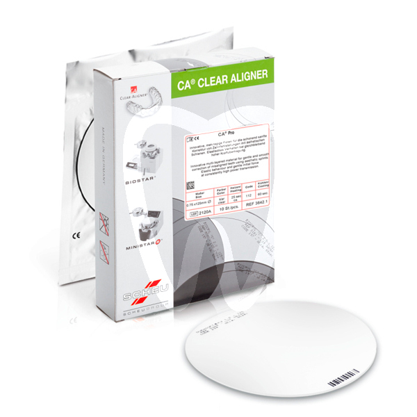 30 days return guaranteeCA PRO CLEAR ALIGNER 0.75X125MM 3642.1 is a three-layer clear aligner plate designed for orthodontic laboratory workflows. It features a flexible elastomer core encapsulated within a double hard elastic shell, intended to support continuous force transmission with minimal force loss. The flexible elastomer layer provides high elasticity and break resistance while reducing initial force, contributing to improved patient comfort. Supplied in a pack of 10 units.