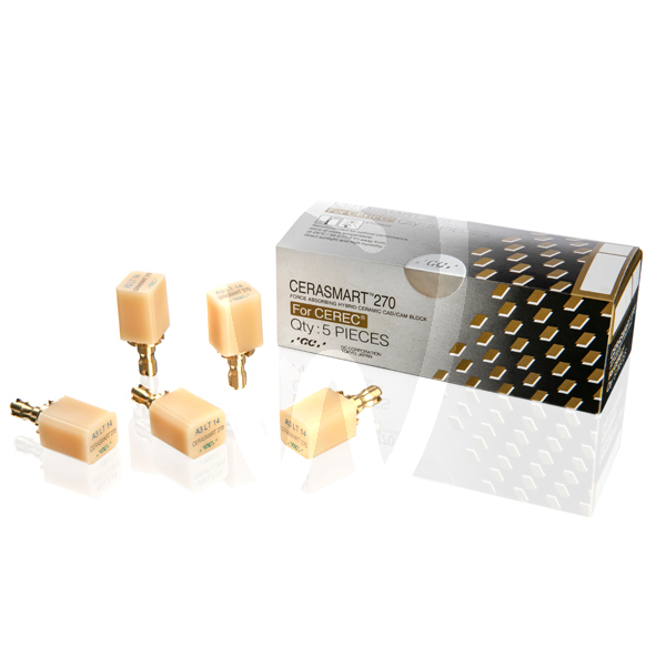 Indicated for CAD/CAM fabrication of indirect restorations where a balance of strength, precision and natural aesthetics is required. Suitable for fast laboratory production with CEREC-compatible milling, supporting reliable seating thanks to accurate milling and strong marginal adaptation. For luting, GC recommends cementation of 270 with a resin cement (dual-cure universal or light-cure), following the cement and restoration manufacturer’s protocols.