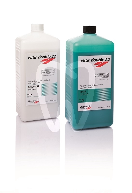 30 days return guaranteeELITE DOUBLE 22 SHORE-A 1KG+1KZ HERMACK is an addition-cured (A-silicone) duplicating silicone for dental laboratory model duplication and investment casting workflows. It is designed for duplicating models with slightly pronounced undercuts and for producing molds used in casting investments, supporting accurate reproduction of laboratory details. The kit includes 1 x 1 kg Base bottle and 1 x 1 kg Catalyst bottle.