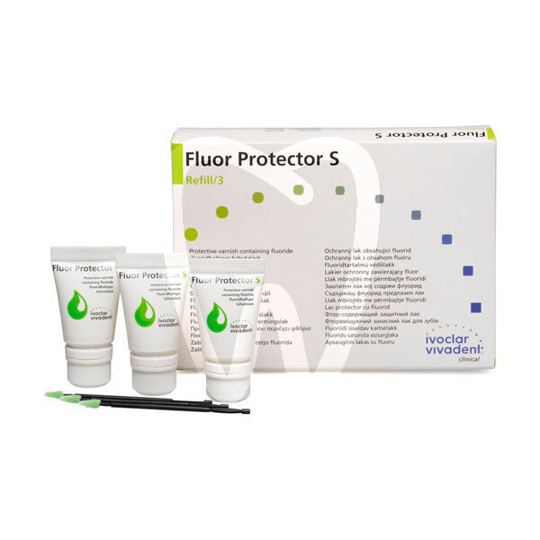 30 days return guaranteeFluor Protector S is a protective varnish for desensitisation and caries prophylaxis containing 1.5% ammonium fluoride (corresponding to 7700 ppm fluoride). - Treatment of hypersensitivity and exposed cervicals. - Increases dental enamel’s resistance to acid. - Long-term protection against caries. - Treatment after professional whitening. Fluor Protector is applied every six months. Supplied in a multidose dispensing tube with enough material for between 20 and 30 full sets of teeth or in single-dose tubes for application to one full set of teeth.