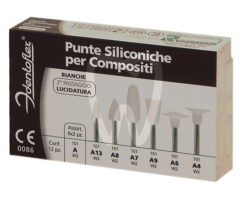 30 days return guaranteeGOMMINI MONTATI BIANCHI A13W (12 pcs) are silicone-mounted polishers on a mandrel designed for finishing and polishing restorative materials. Indicated for chairside use in conservative dentistry and prosthodontics, they support the refinement and polishing of composites, amalgam and metals, and can also be used for prophylaxis procedures, even without polishing pastes.