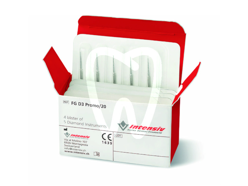 30 days return guaranteeINTENSIV PROMO FG 219 GR1 20 pcs is a promotional pack of identical dental burs for clinical use, supplied in a convenient 20-unit format. The kit includes two practical bur holders, designed to support organized storage and faster access during restorative and prosthetic workflows where consistent bur selection is required.