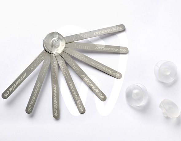 30 days return guaranteeManual stainless steel instrument for the measurement and control of tooth distances heated during IPR protocols During orthodontic treatments using the interproximal stripping process, predefined and measured interdental spaces must be created. With the stripping method, measurable and calibrated spaces are created through the removal of dental tissue in order to obtain exactly the space necessary for the movement of teeth into a harmonious and correct position. Practical Tips Height of measuring part: 4mm • Length of measuring part: 40mm • Total length of instrument: 50mm • Plastic clip as fastening system of the 8 elements in the grip • Sterilizable (with exception of plastic clip) and reusable • IPR-DC is inserted in the vestibular/buccal direction. • If the designated instrument does not enter into the interdental space created, proceed to measure the interdental space with the thickness gauge immediately below or through a combination of 2 or more instruments. • If the designated instrument has too much play in the interdental space created, proceed to measure the interdental space with the thickness gauge immediately above or through a combination of 2 or more instruments. • In order to assemble the Intensive IPR-DistanceControl Set, insert the plastic rivet inside the holes of the 8 superimposed metal instruments and apply pressure to engage the head in the rivet. • In order to disassemble the Intensive IPRDistanceControl Set, remove the head from the rivet by applying outward pressure