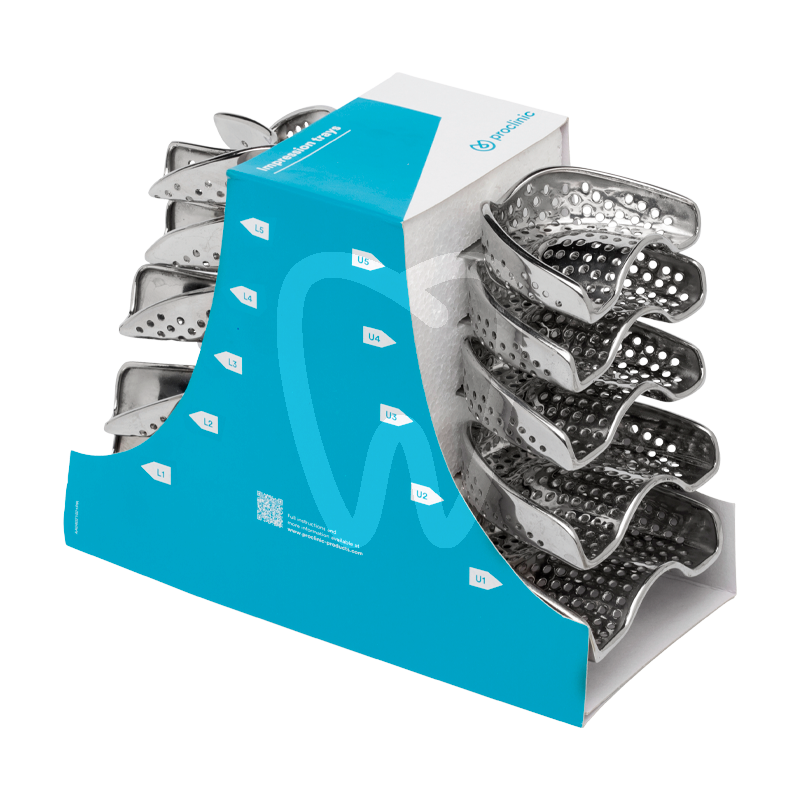 30 days return guaranteeCase with 10 impression trays. Manufactured in stainless steel, perforated and with retention rim. It contains 5 upper trays and 5 lower trays. Sizes: U1, U2, U3, U4, U5 and L1, L2, L3, L4, L5.