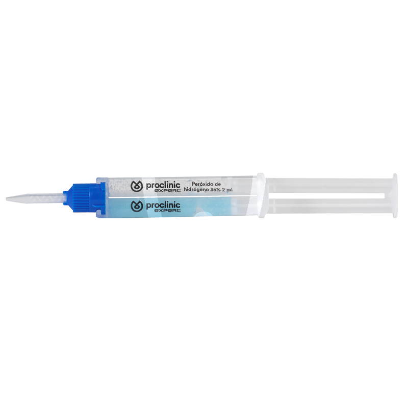 Proclinic Expert whitening gel with a 35% concentration of hydrogen peroxide for professional treatment in the dental practice on vital and non-vital teeth. Gel with dual activator, can be used with or without whitening lamp according to the needs of the professional. Its content of photoactivatable microcrystals WPA (Whitening Process Accelerators) enhances the action of the photoactivator gel under the action of light from the lamp. Results in just one session of 30 minutes. Its exclusive composition of aloe vera, along with potassium nitrate, offers greater desensitizing action and does not damage the enamel thanks to its neutral pH. Presentation in a comfortable automix syringe that facilitates the handling and application of the product in a precise and homogeneous way. Its coloring in light blue facilitates the application to be a visible gel. Mint flavor with refreshing action. Combined treatment with Proclinic Expert Whitening for home use at 10% or 16% carbamide peroxide is recommended.
