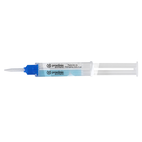 Proclinic Expert whitening gel with a 35% concentration of hydrogen peroxide for professional treatment in the dental practice on vital and non-vital teeth. Gel with dual activator, can be used with or without whitening lamp according to the needs of the professional. Its content of photoactivatable microcrystals WPA (Whitening Process Accelerators) enhances the action of the photoactivator gel under the action of light from the lamp. Results in just one session of 30 minutes. Its exclusive composition of aloe vera, along with potassium nitrate, offers greater desensitizing action and does not damage the enamel thanks to its neutral pH. Presentation in a comfortable automix syringe that facilitates the handling and application of the product in a precise and homogeneous way. Its coloring in light blue facilitates the application to be a visible gel. Mint flavor with refreshing action. Combined treatment with Proclinic Expert Whitening for home use at 10% or 16% carbamide peroxide is recommended.