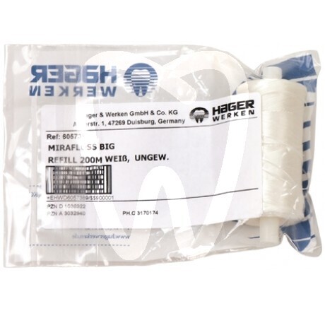 30 days return guaranteeMIRAFLOSS Refill 200 m White Unwaxed Interdental Floss is a professional spool of unwaxed white dental floss designed as a refill for the Mirafloss dispenser. Intended for preventive dentistry and daily prophylaxis workflows, it supports interdental plaque and food debris removal as part of patient oral hygiene instruction and chairside prevention protocols.
