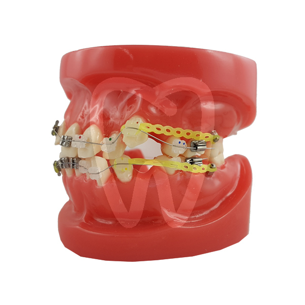 Indicated for orthodontic case presentations and patient consultations where a physical model helps illustrate fixed appliance therapy with ceramic brackets. Suitable for explaining basic biomechanics concepts, bracket positioning on teeth, oral hygiene recommendations around brackets, and what patients can expect during fixed orthodontic treatment.