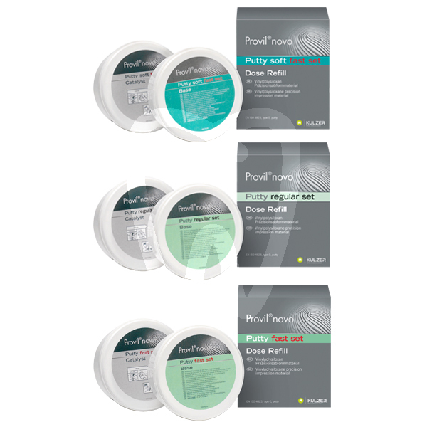 30 days return guaranteeSofter final hardness. Hydroactive impression material: The best option. While being applied impression materials repeatedly come into contact with moist surfaces. Here is where the positive benefits of hydroactivity become evident. Hydroactive Provil® Novo has excellent wetting properties but without absorbing liquid. Therefore no moisture is absorbed and the initial volume is guaranteed to remain constant. Hydroactivity improves: - The wettability of dental structures and the mucosa during impression taking. - The surface quality of plaster models. The result: - Sharp reproduction of every detail in every impression, including in moist environments. - Does not suffer volume changes caused by absorbing water. - Disinfectable - Dimensionally stable. Plaster models have smooth surfaces and are void-free. The system: For perfect temporal coordination: rapid and normal setting. New Provil® Novo convinces with its clearly improved quality and its increased range of indications. Provil® Novo components set new standards and meet all demands in terms of customisation and diversity of usage. The modular configuration of Provil® Novo viscosities, formulated to produce ideal combinations, ensures an optimal application in all clinical situations and for all impression-taking techniques. Additionally, the chance to select between fast and normal set options offers maximum time flexibility. Fast set: Saves time when used for typical situations, such as single crowns, small bridges and prosthetic work. Normal set: Allows enough time for large prosthetic restorations. Expiry date of 3 years.
