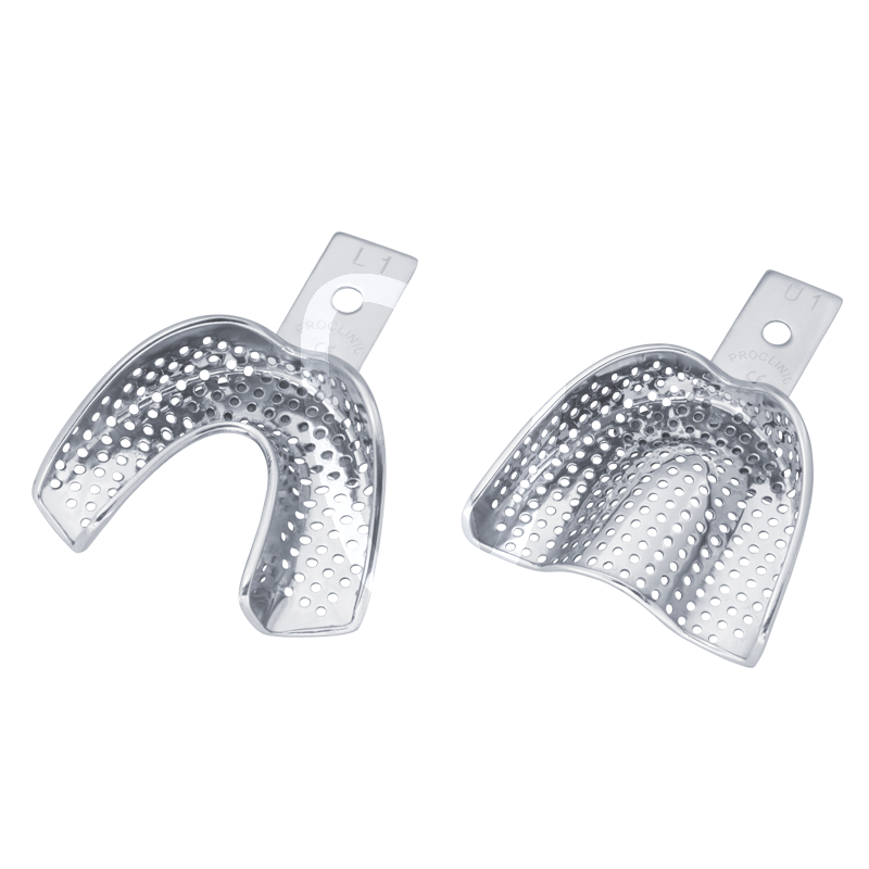 Replacement packages of impresssion trays made of stainless steel, perforated and with retention rim.