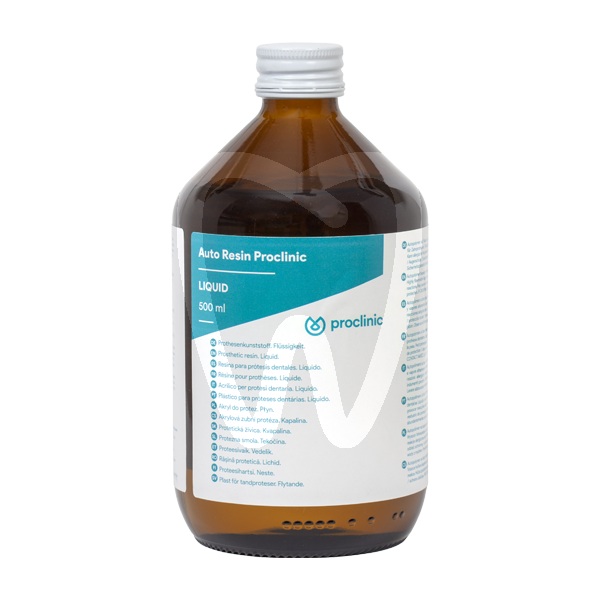 30 days return guaranteeRESINA AUTOPOLIMERIZZABILE PROCLINIC LIQUIDO 500 ML is a methyl methacrylate (MMA)-based monomer liquid designed for self-curing denture base acrylic resin systems. Intended for dental laboratory workflows, it is used as the liquid component to prepare autopolymerizing acrylic resin for the fabrication, repair, and relining of removable prostheses under standard bench-curing protocols.