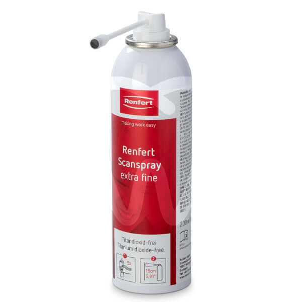 30 days return guaranteeThe extra fine Renfert-Scanspray can be applied very thinly due to its micro-fine and homogeneous structure. Improved adhesion, especially to ceramics / polished metals as well as to reflective surfaces.
