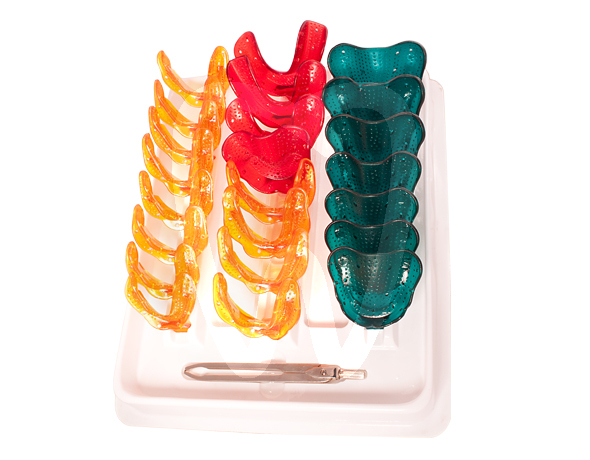 30 days return guaranteeMade from polycarbonate. Sterilisable. Autoclavable, polycarbonate trays for impression taking in edentulous or partially edentulous mouths. System specifically designed for high-precision impression taking for removable prostheses. These anatomical trays are fitted with ridges behind the upper and lower molars which exert the correct pressure on the gums; a vitally important factor a perfect fit of the dentures. Technical features: Reusable polycarbonate material that can be sterilised in a steam autoclave at 140°C. No adhesives required due to presence of three mechanical retention features on tray surface: - Dotted surface - Stabilising ridges - Perforations Each piece is hand finished and individually checked. Advantages: The anatomical shape of the dental arch combined with the retromolar ridges ensures a technically perfect impression from the 13 different jaw sizes. Furthermore the upper arch trays reproduce natural irregularities, sliding delicately around the spaces behind the gums without irritating the palate. Superform can produce the accuracy of an anatomical impression holder without the added cost of an individual tray. Polycarbonate makes the trays light and easy to manage, but also highly resistant to breakage and deformation. A caliper is provided for correctly measuring the space between the corners of the patient’s mouth or, in the case of partially edentulous patients, between the corners and any existing denture. The Superform Tray System kit contains 24 pieces that have been statistically selected to cover the widest possible range of patient dental configurations. Colour-coded for rapid selection of desired shape.