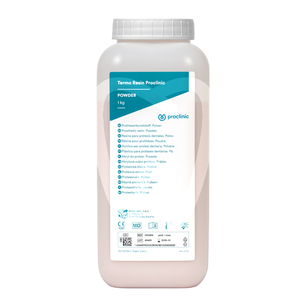 30 days return guaranteePROCLINIC Heat-Polymerizable Resin – Pink Powder 1 kg is a laboratory denture base material based on methyl methacrylate (PMMA) supplied as a powder to be used with its corresponding liquid monomer. Designed for hot curing, it is indicated for the fabrication of complete dentures through press and pressure processing techniques, providing a reliable option for routine dental laboratory workflows.