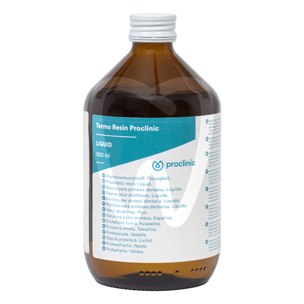 30 days return guaranteeRESINA TERMOPOLIMERIZZABILE PROCLINIC LIQUIDO 500 ML is a methyl methacrylate (MMA)-based liquid monomer intended for laboratory use as part of a heat-polymerizable denture base acrylic resin system. It is used in combination with the corresponding polymer powder to manufacture denture bases and related prosthetic components processed by hot curing, supporting consistent workflows in removable prosthodontics.