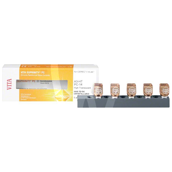 30 days return guaranteeVITA SUPRINITY PC CEREC 0M1-HT PC-14 is a CAD/CAM glass-ceramic (lithium silicate) reinforced with zirconium dioxide, designed for the fabrication of highly aesthetic, individually tailored restorations. Intended for laboratory and chairside digital workflows, it is used to mill restorations such as inlays, onlays, partial crowns, veneers, and anterior/posterior crowns, including individual anterior and posterior restorations on implant abutments. The 0M1 shade and high-translucency (HT) option support natural-looking results, particularly in minimally invasive indications.