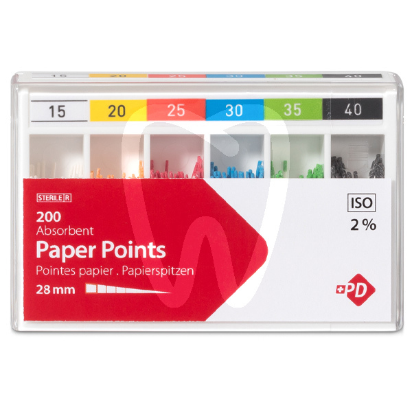 Sterile absorbent paper points with 2% conicity. 28 mm. Marks at 16 mm, 18 mm, 19 mm, 20 mm, 22 mm and 24 mm.