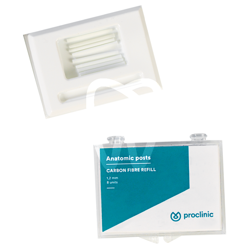 30 days return guaranteeThe Proclinic endodontic range has been expanded with new fibreglass and carbon-fibre posts, a major innovation in the prosthetic reconstruction of devitalised teeth. - Proclinic anatomical posts are manufactured in special fibreglass and epoxide resin, for optimum affinity with cements typically used to bond and reconstruct cores. - The wide range of sizes ensures that there is always a post that adapts to the canal anatomy, without any loss of root dentine. - The micro-grooved surface and, in the case of fibreglass posts, the dentine-like colour guarantee optimum contact with the surface of the tooth, increasing axial resistance and providing a colour similar to that of dentine in visible areas. Features: Elastic modulus akin to that of dentine. No root fracture. Longitudinal fibres. No oxidation or corrosion. Cylindrical-conical shape. Physicochemical compatibility between post, cement, dentine and reconstruction. Easy to use. Great value. Micro-grooved surface. Advantages: Post can be easily removed for subsequent treatments. Stable and biocompatible. Post is fracture resistant. Uniform distribution of occlusal forces and no periodontal damage. Made from a single piece. Considerable cost savings. Better contact with bonding agent.